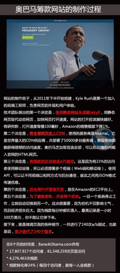 2012美国大选现在已结束,奥巴马有惊无险地击败罗姆尼。他最终筹到11亿美元,成为历史上筹款金额最高的总统候选人。这11亿美元之中,单BarackObama.com一个网站,就创造2.5亿美元的捐款。 看看历史上最牛筹款网站是如何产生,有哪些值得学习的地方。
