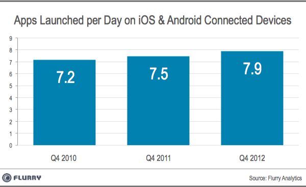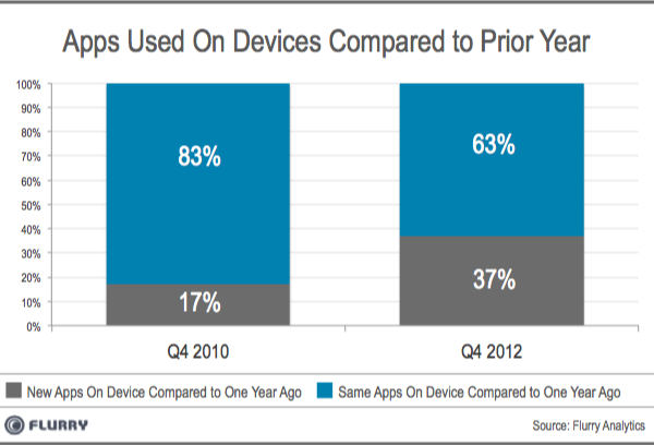 在 2010 年第四季度,只有 17% 的 App 相对于前一年是新的,而到了 2012 年第四季度,这一数字变为了 37%。Flurry 相信,鉴于用户对新应用的接纳态度,应用市场仍然存在突破的可能。