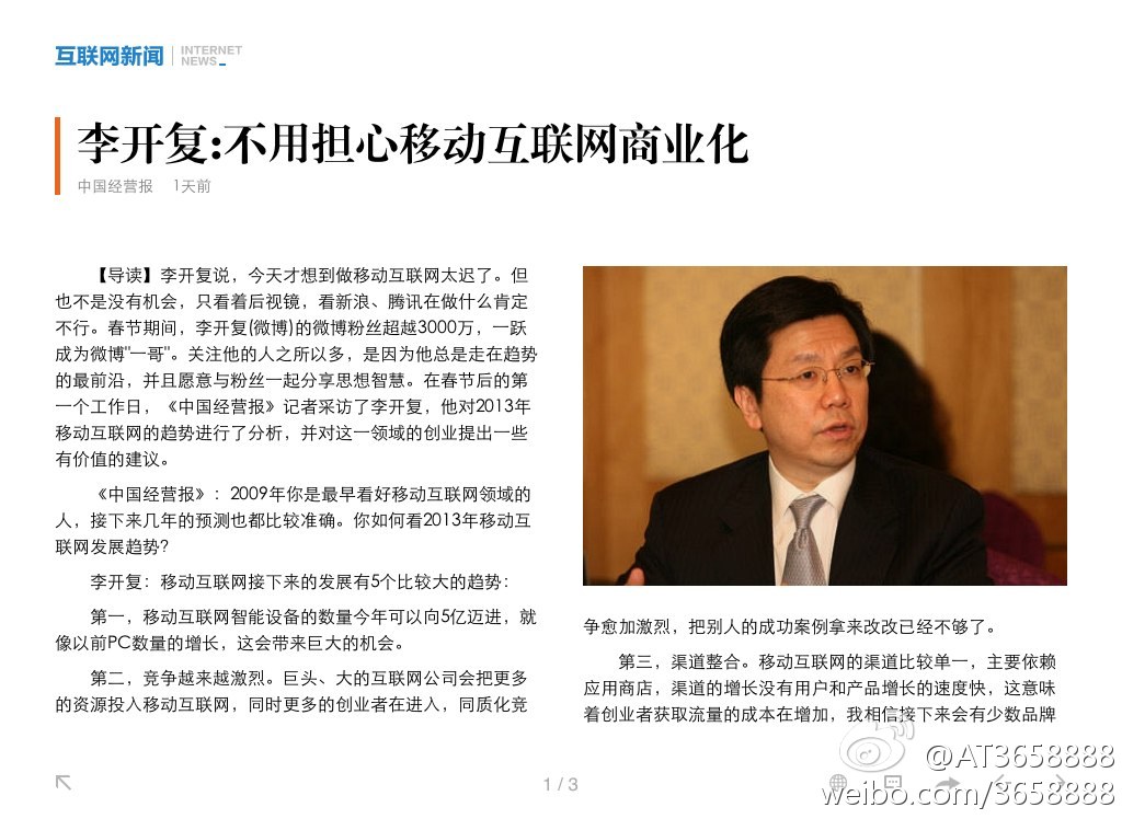 《中国经营报》:2009年你是最早看好移动互联网领域的人,接下来几年的预测也都比较准确。你如何看2013年移动互联网发展趋势?