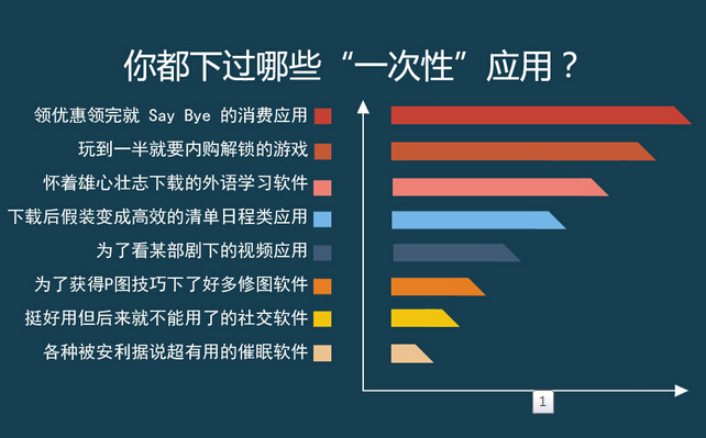 结果表明,许多会持家的人儿为了得到十块八块的优惠券,甘愿下载一个根本不需要的 APP,并花整整十五分钟填写个人信息,享受完优惠券后即删(15.6%);除了快乐地捡小便宜,更多的“一次性”APP 是主人怀抱着雄心壮志下载,兴冲冲打完第一天卡,接着被塞在角落长蘑菇,唯一的作用就是用来暗示自己是上进的好少年(24.8%)。
