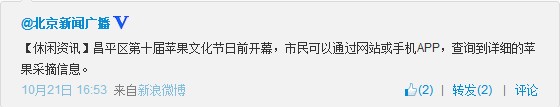 【休闲资讯】昌平区第十届苹果文化节日前开幕,市民可以通过网站或手机APP,查询到详细的苹果采摘信息。