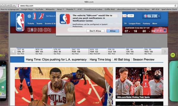 其实,苹果去年发布的 OS X Mavericks 中更新的的 Safari 就已具有推送通知服务,它允许用户订阅网站的通知功能,即使 Safari 不运行用户也能收到推送通知。当时,NBA.com 和《纽约时报》网页版等网站,也已开始支持 Safari 的推送通知功能。